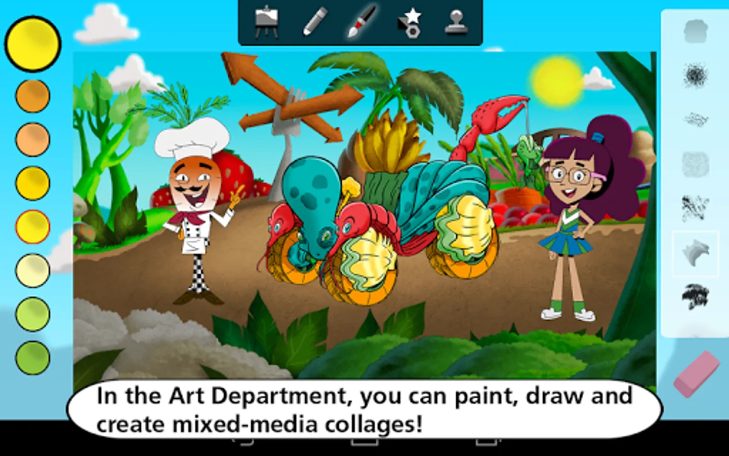 – In the Art Department, using images of the U of Chew and Tastee Town, there are dozens of simple-to-use, immersive painting, drawing, and mixed media collage tools. Images can be saved to a device's photo library for sharing.