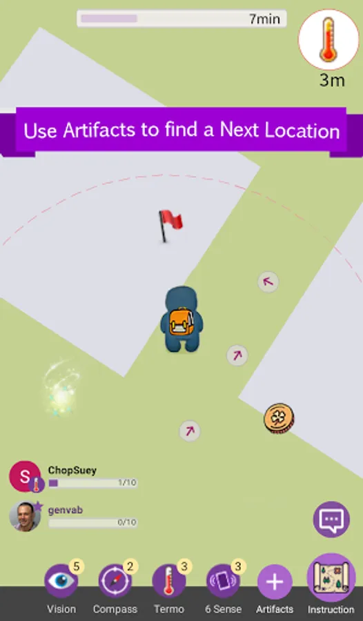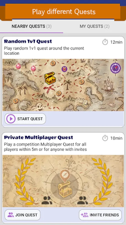 (2) Start/Join generated 1v1 or Multiuser PvP Treasure hunt quests. Where you can compete with other players to search linked secret locations (like virtual geocaches), by using different textual or visual clues and/or useful artifacts collected/gained before.