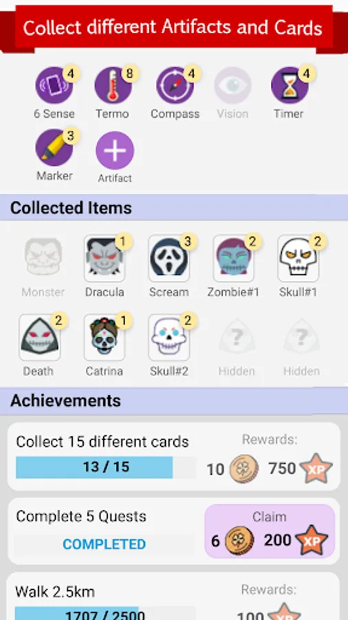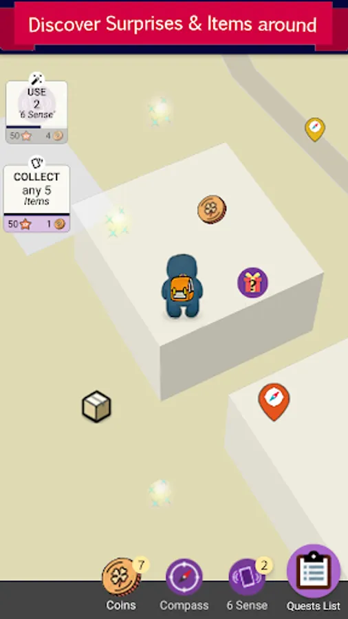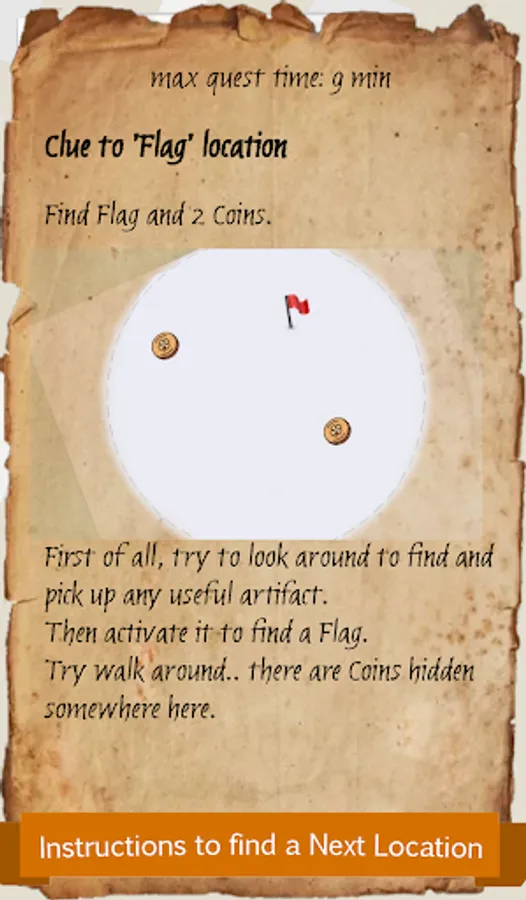 * Collecting or purchase quest's artifacts and coins to get hints to the next locations