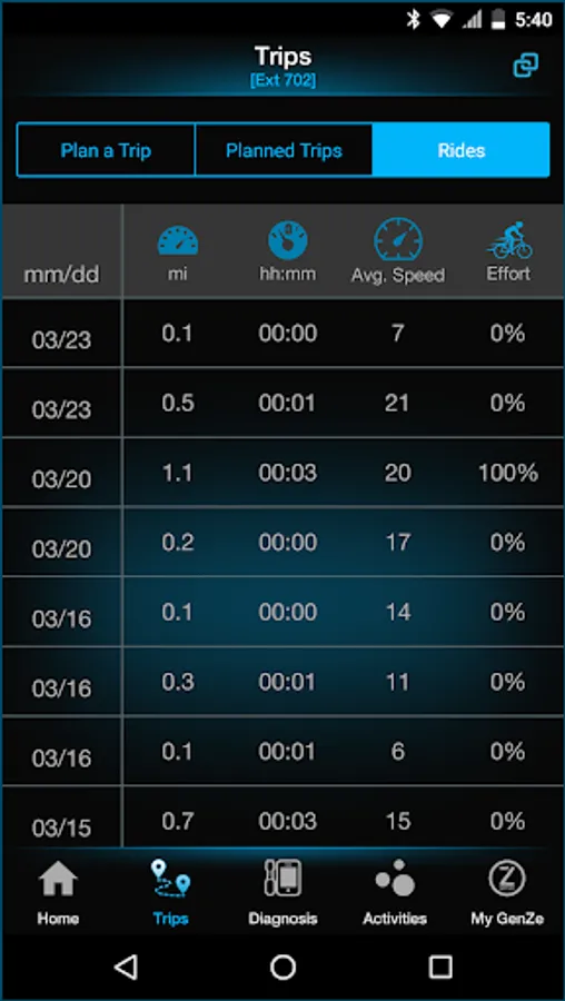 - Ride history, including distance, Watt hours per mile, Avg. speed, and rider effort percent per trip
