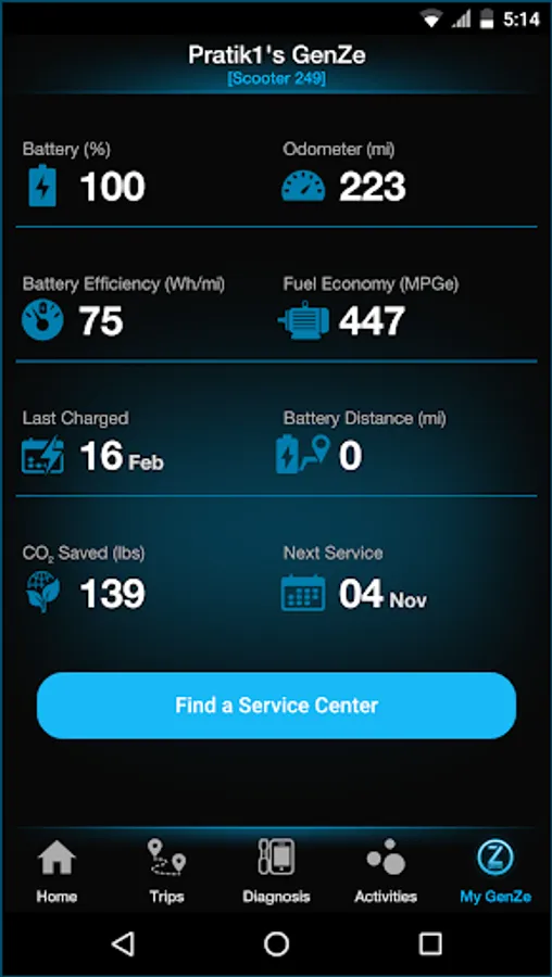 - Ride history, including distance, Watt hours per mile, MPGe, and Carbon Dioxide pounds saved per trip