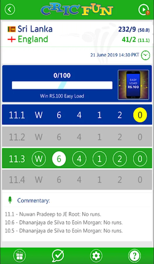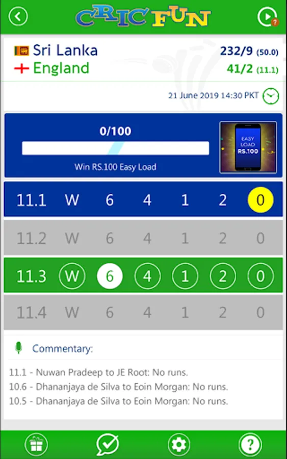 You will be given possible outcomes for every ball where you will select the one which you think is more likely to happen on the next ball. If your prediction is correct you get points for that. If your prediction is wrong, well, you still get points for the attempt. Play the predictions long enough to accumulate enough points to get your chance on winning the prizes. More you play, the more prizes you will get a chance to win.