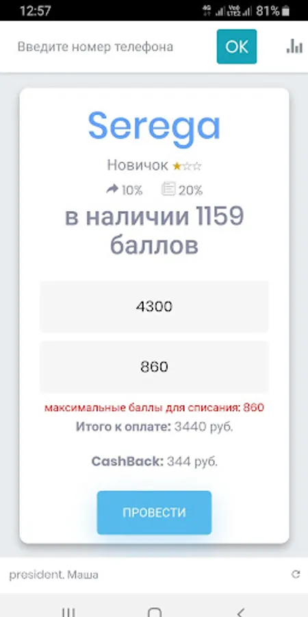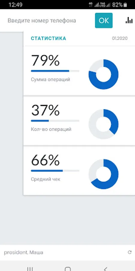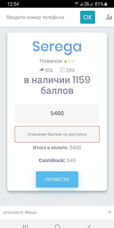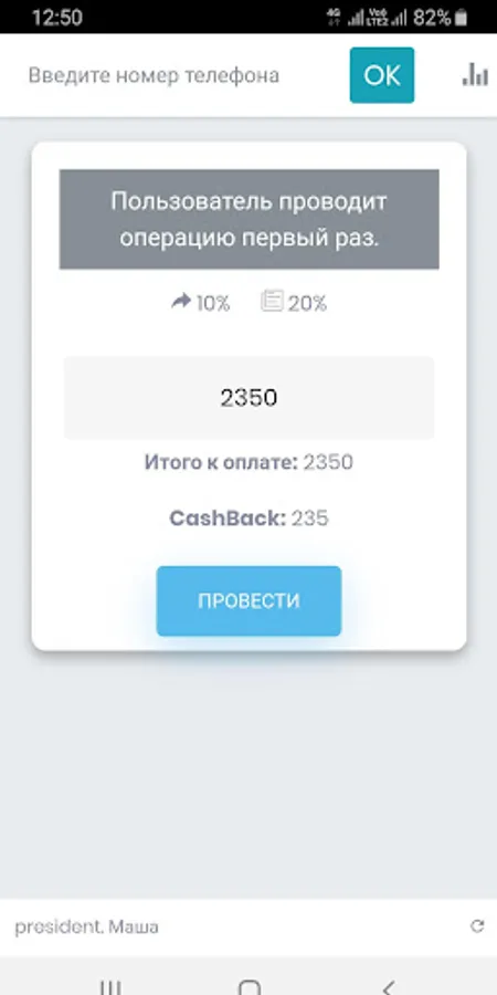 Using the “Vo! Cashier” application, an employee of the company participating in the “Vo!” Loyalty system will be able to pay for the goods / services to accrue or debit the cashback to the client. Also in the application, an employee can see his KPI if he is configured by the administrator of the Vo! Loyalty system.