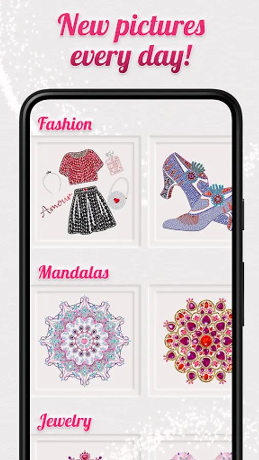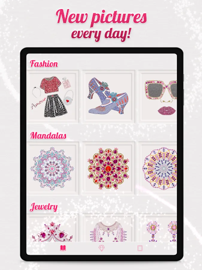 • Family-friendly content: color anti-stress Dazzly pictures of mandalas, animals, jewels, and much more.