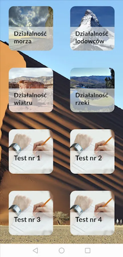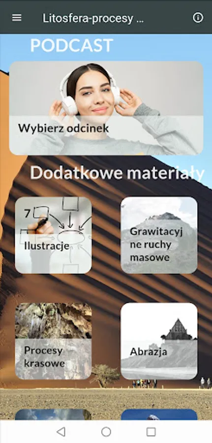 In this application you will find a set of GeoEducation podcasts in the field of Lithosphere, which is part of the geography material from the extended level for the first grades of high school. This section discusses the external processes that shape the Earth's surface.