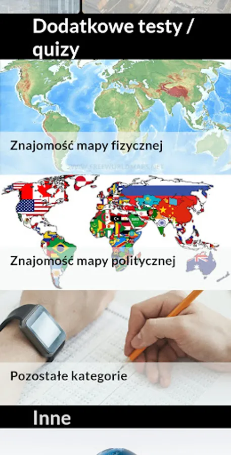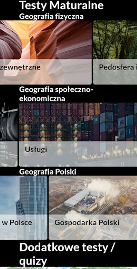 Matura Geo Challenge is an excellent educational application that will help you effectively prepare for your matura exam in geography and prepare for current geography lessons in high school. It contains a set of interactive quizzes that cover a variety of geographic issues that appeared in previous years on matura exams. The whole material is divided according to the following key (which makes it easier to divide learning into parts):