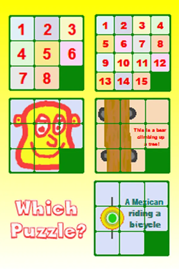 Slide your puzzle to create a Mexican on a bicycle or a bear climbing a tree and the standard 3x3 and 4x4 number puzzles.