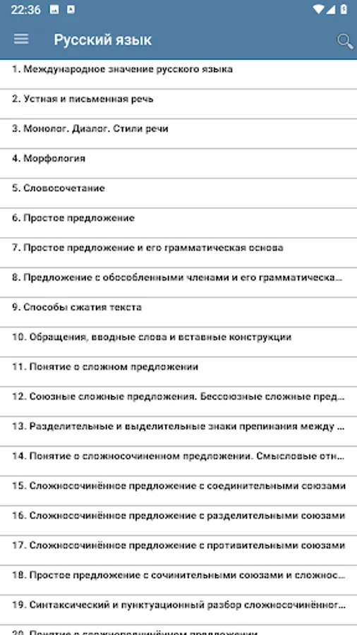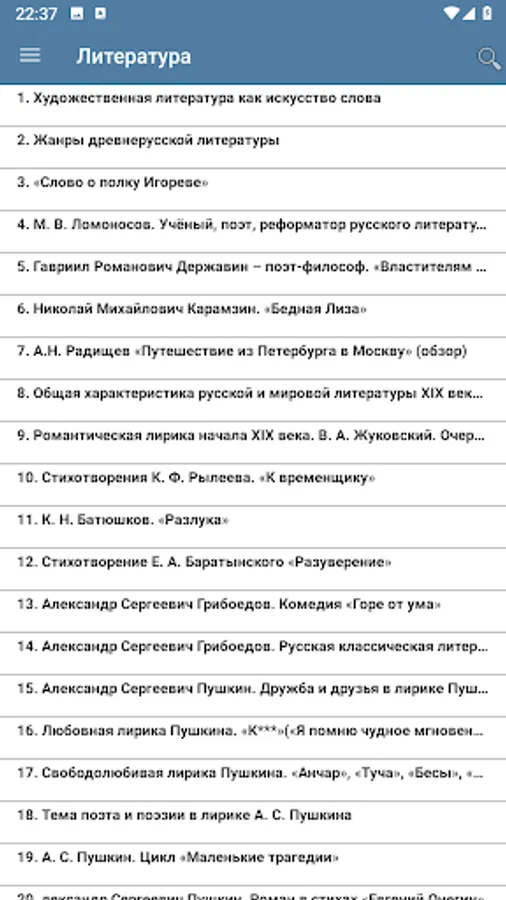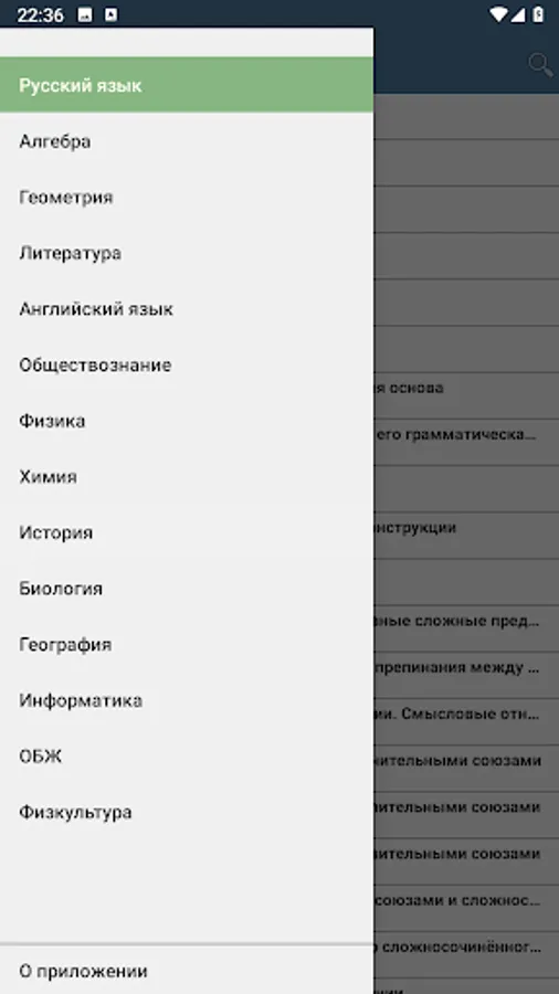 The application presents all the subjects of grade 9: Russian, algebra, geometry, literature, English, social studies, physics, history, biology, geography, technology, computer science, fine arts, physical education, music.