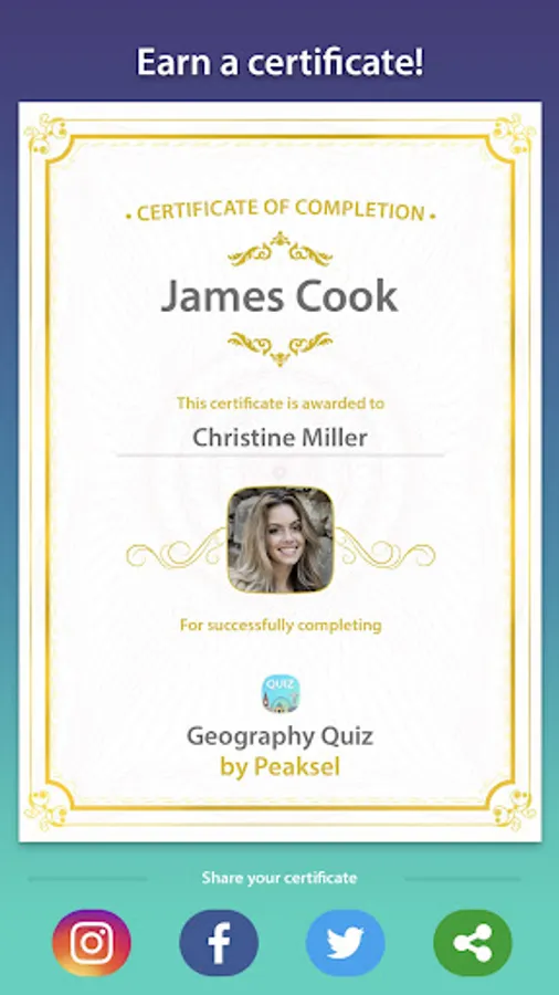 🏅 A certificate awarded when you complete all Learn Geography Trivia: World Map Quiz challenges!