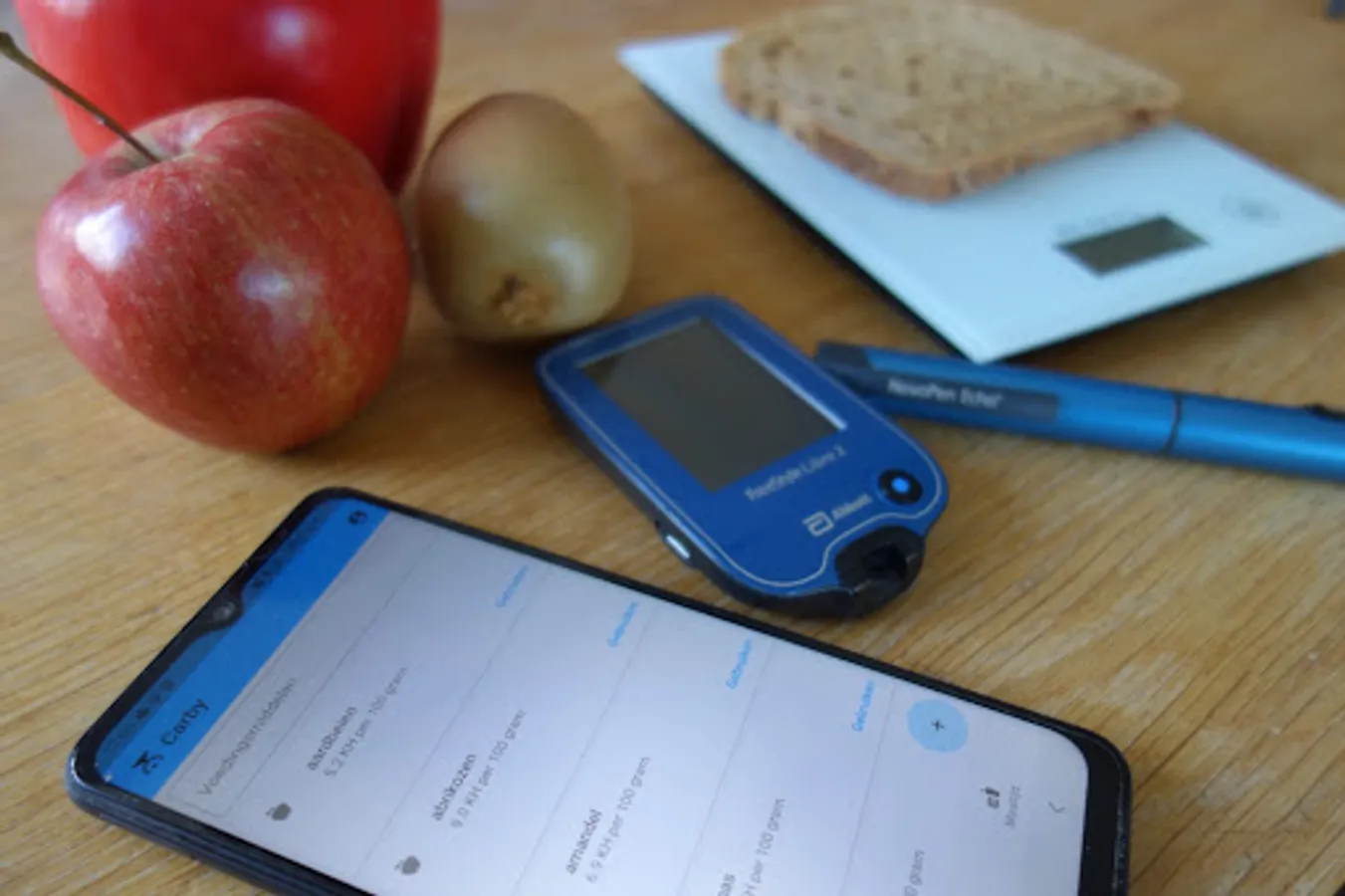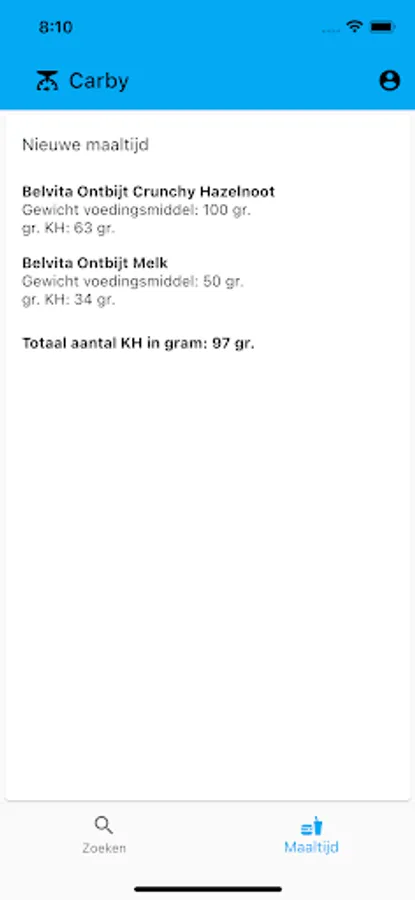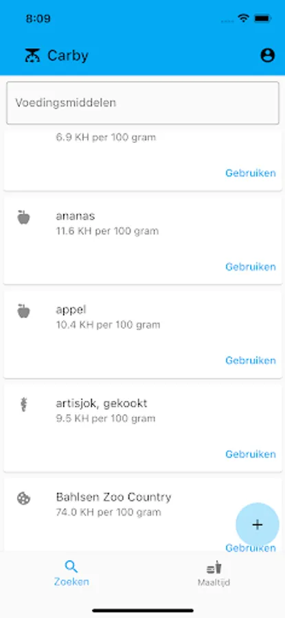 Carby has an ingredients list with an efficient search function. You can easily personalize this list by adding foods yourself. Personal ingredients are stored in your account, so you can use them with multiple devices.