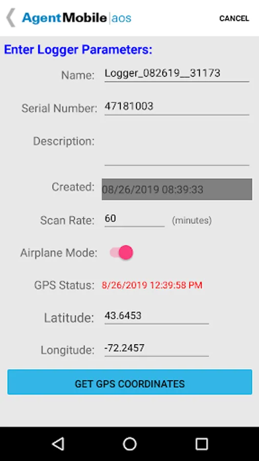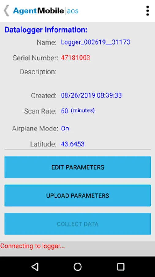AgentMobile is a compact Android application that allows communication with a stand-alone 8900 GeoNet datalogger. The initial release (1.0) will allow setting of the logger scan rate, system time and Airplane Mode. Subsequent releases will add data collection and exporting of data