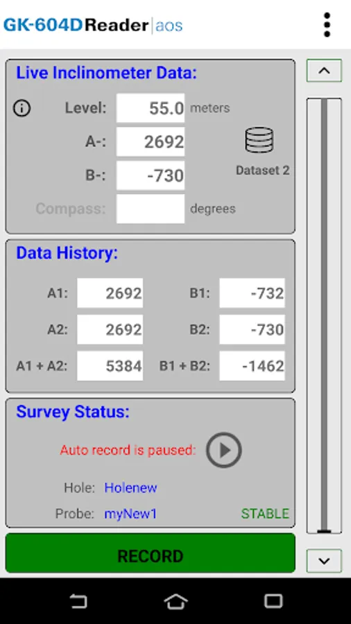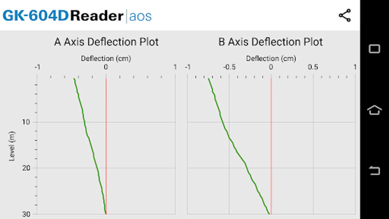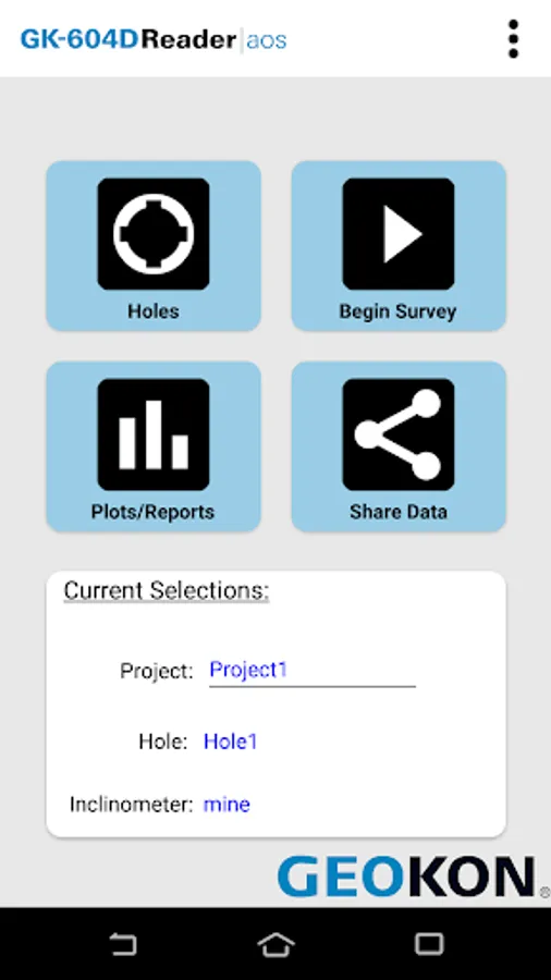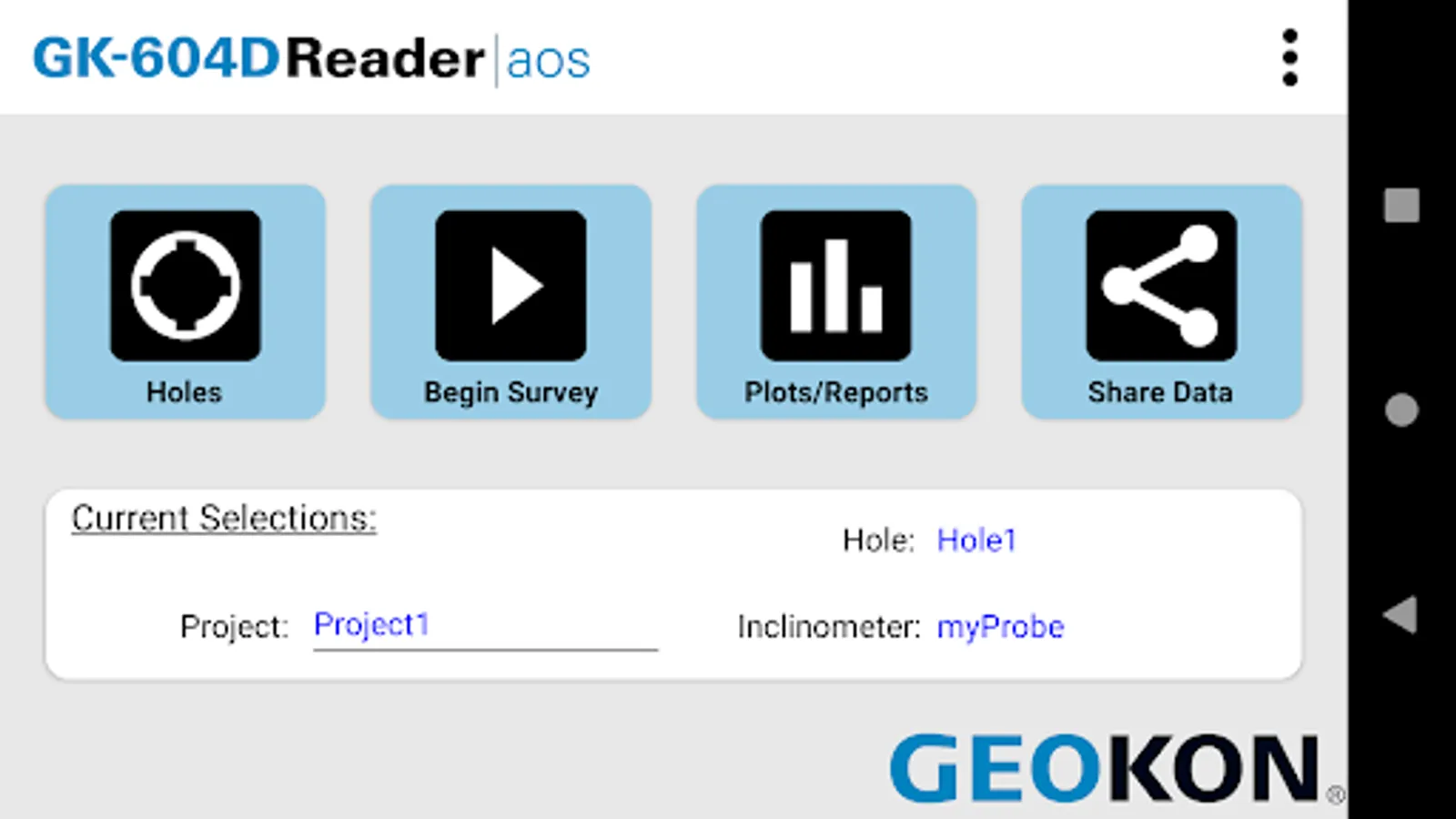 The GK-604D Inclinometer Reader | aos Application installs and runs on an Android Device and is designed to communicate via Bluetooth with Geokon Remote Modules connected to Geokon digital MEMS inclinometer probes.