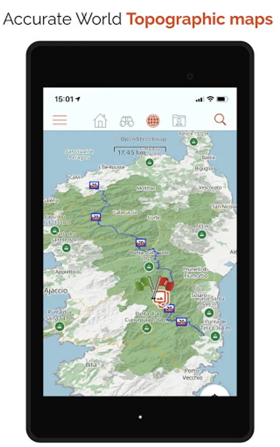 • Advanced tracking and guiding features with calculation of the remaining distance and time and vocal instructions at intersections.