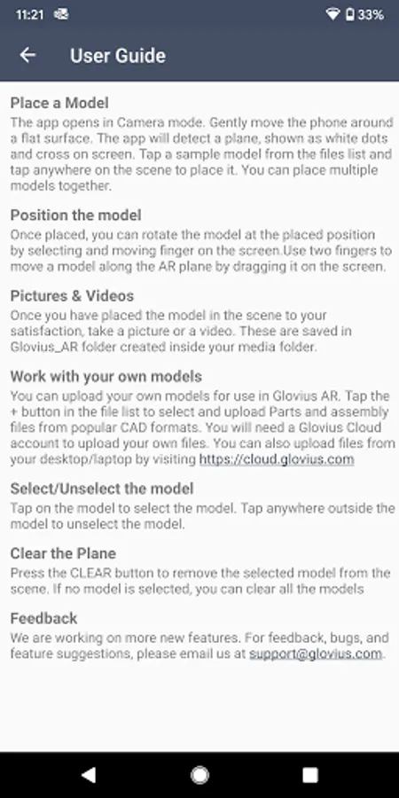 For feedback and suggestions, email us at support@glovius.com. Your feedback is important to us! Don’t forget to tell your colleagues and friends.