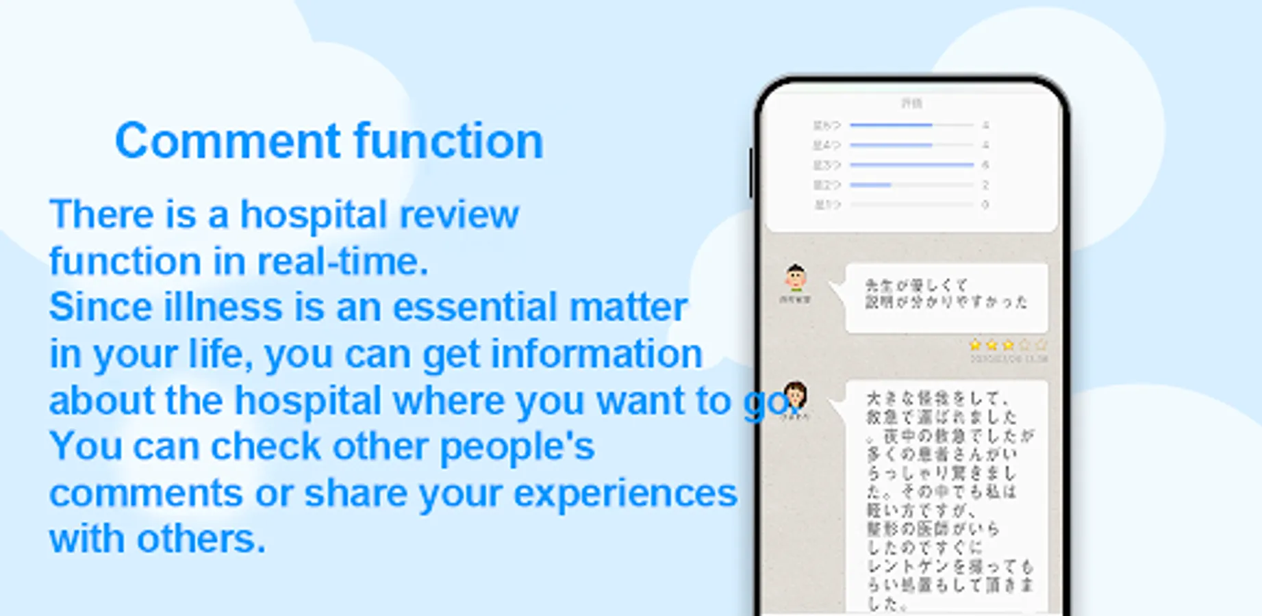 ■ Because you can post reviews, you can share your impressions of using the hospital with other people who have downloaded the app.