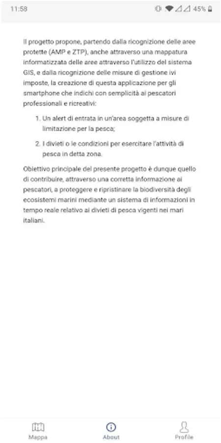 The project proposes, starting from the recognition of the protected areas (AMP and ZTP), also through a computerized mapping of the areas through the use of the GIS system, and from the recognition of the management measures imposed therein, the creation of this application for smartphones that simply indicate to professional and recreational fishermen: