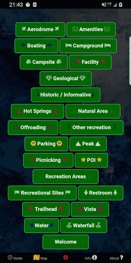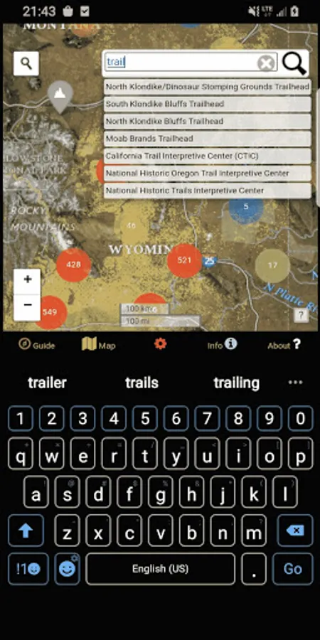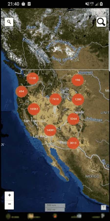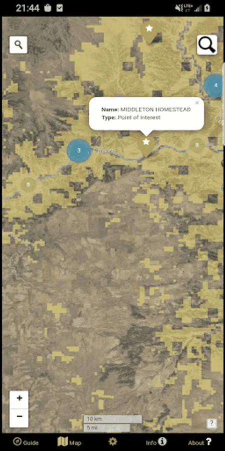 On the Map screen, there are a series of circle clusters at distant zooms that indicate how many points are within a given cluster. As you tap the clusters to zoom in, individual points and icons become visible, along with trails, roads, and boundaries. These features can be clicked on to reveal the name, location, and other useful information. The map screen also has two search tools - the left one can be used to look up addresses and towns, while the right one will allow you to query the names of the features in the database.