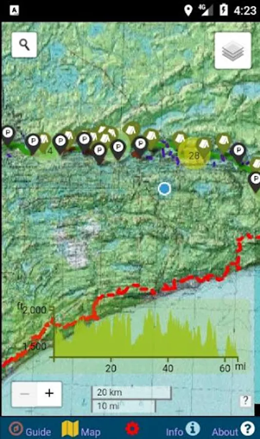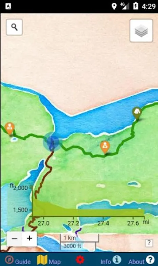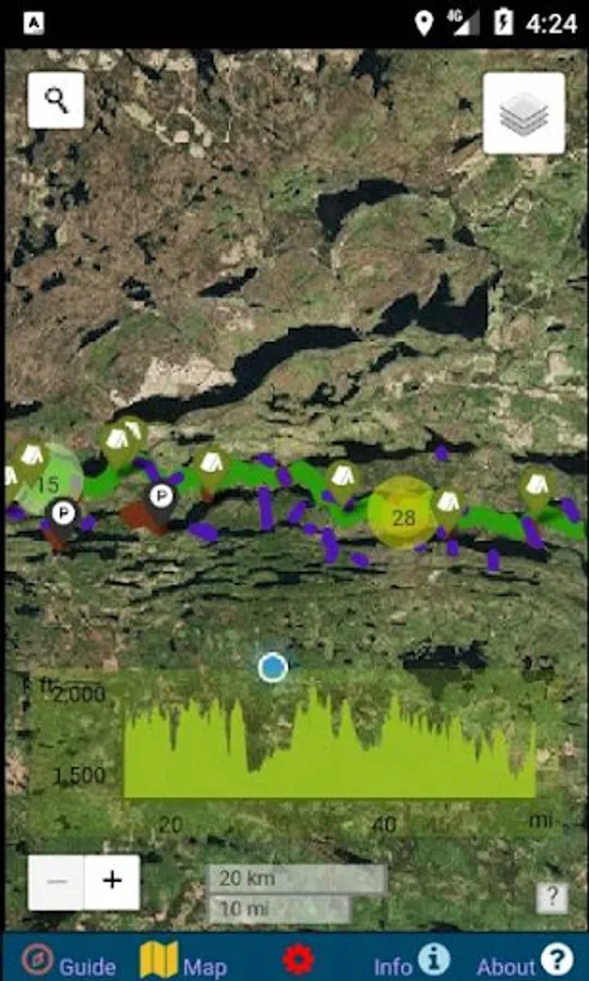 Offline imagery and topographic maps are bundled along with this app so that there is no need for an internet connection after installation. This is important, as the BRT is so remote that any kind of cell phone reception is highly unlikely. The app has the option to utilize GPS to follow your position on the map. This too is very essential, as many parts of the BRT are overgrown, crossed by other trails, and poorly marked. Having the confidence that you are staying on the trail is a blessing when you wish to avoid needing to backtrack.