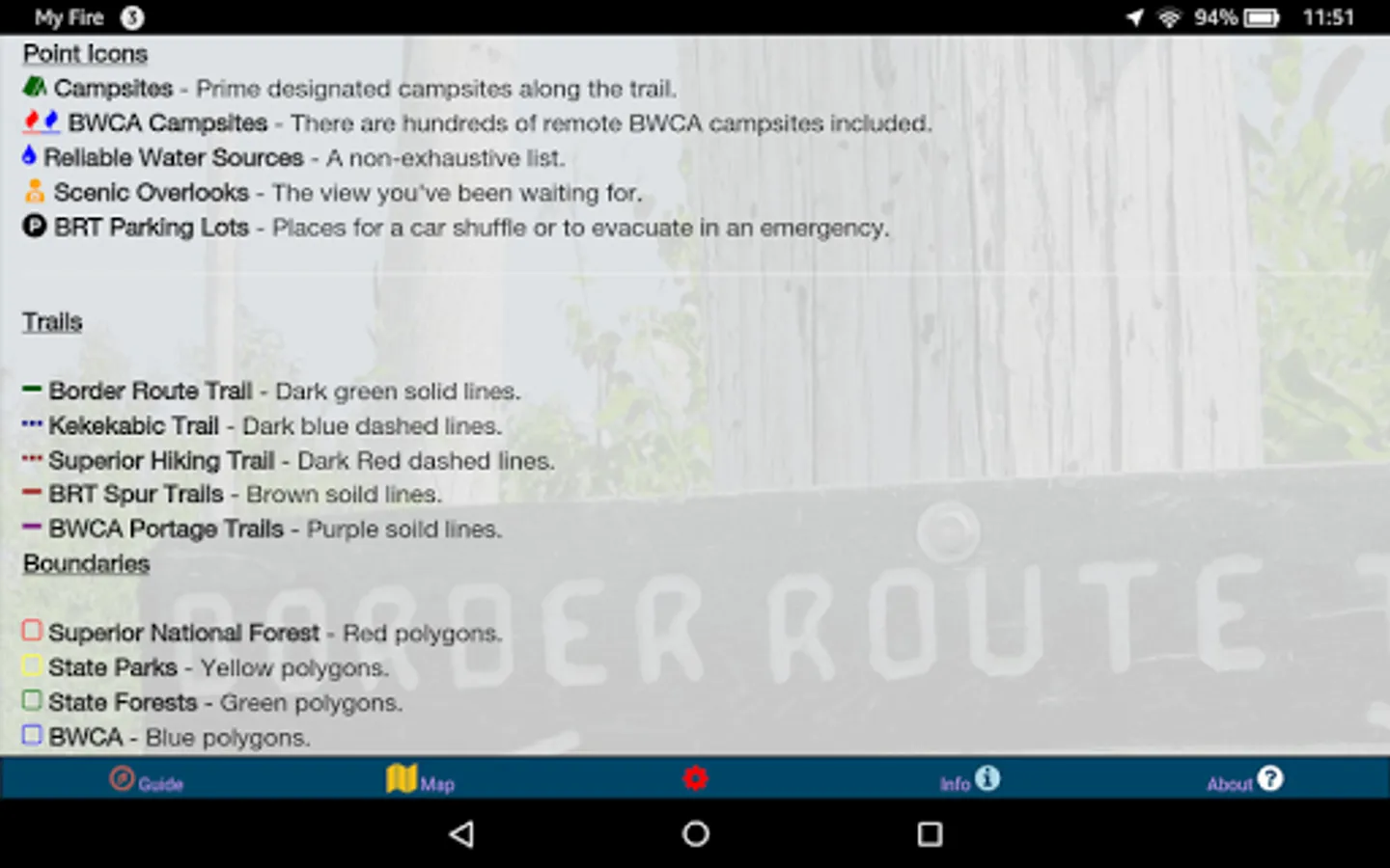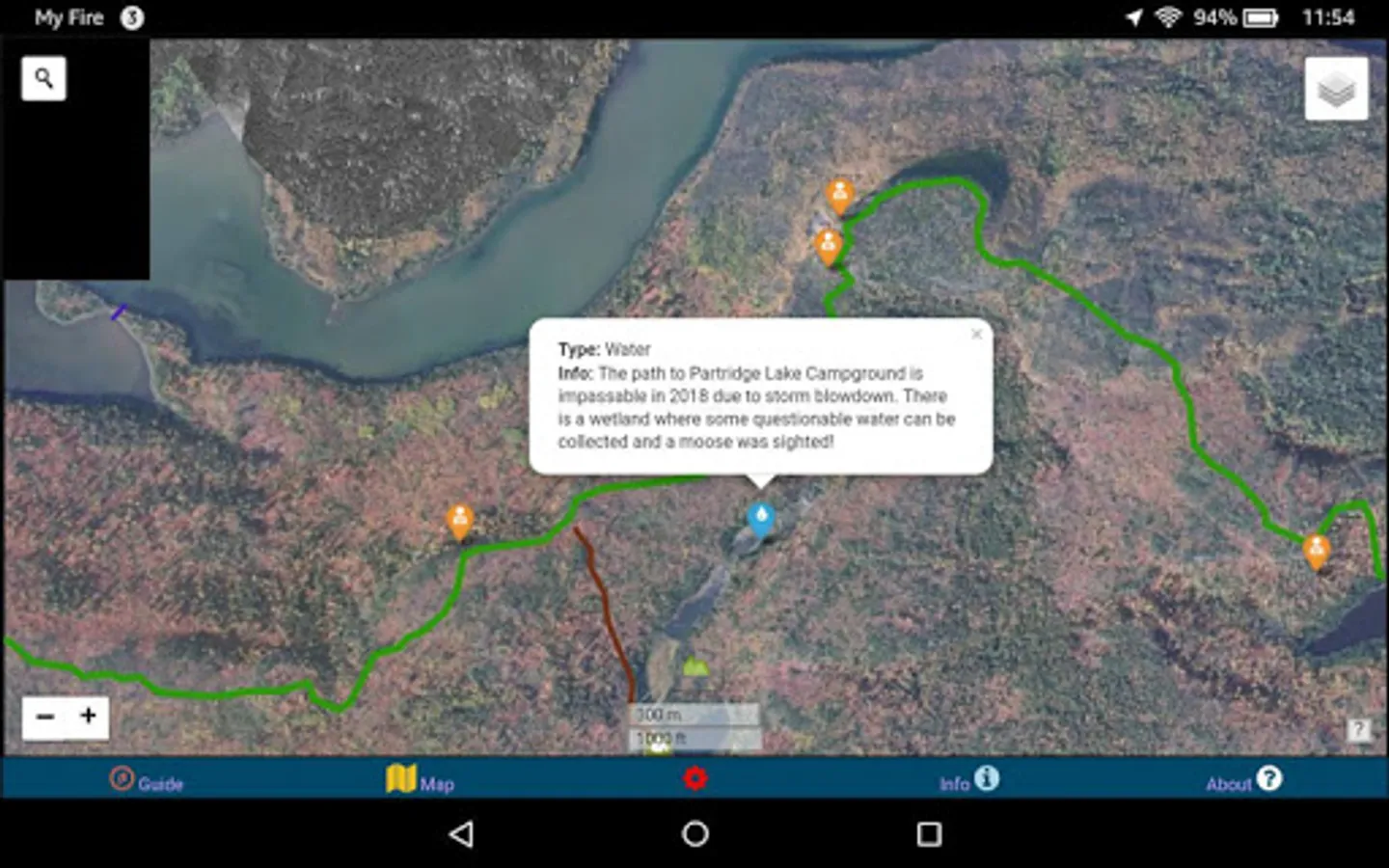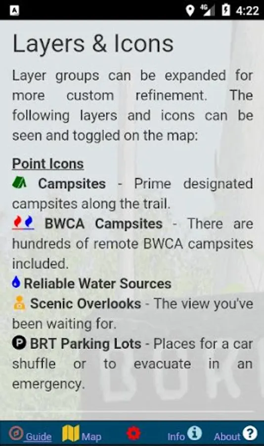 This app was created to assist wanderers in their journey along the BRT. It is loaded with useful trail information including the route of the BRT, portages, spur trails, campsites, vistas, water sources, parking areas, boundaries, evacuation points, and much more! Each data point and trail line is interactive, providing more information when upon tapping. The icons are informative and color-coded for immediate recognition, and layers that are not being used can be turned off to simplify the map presentation.