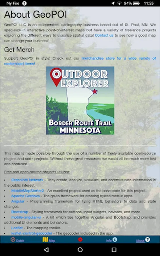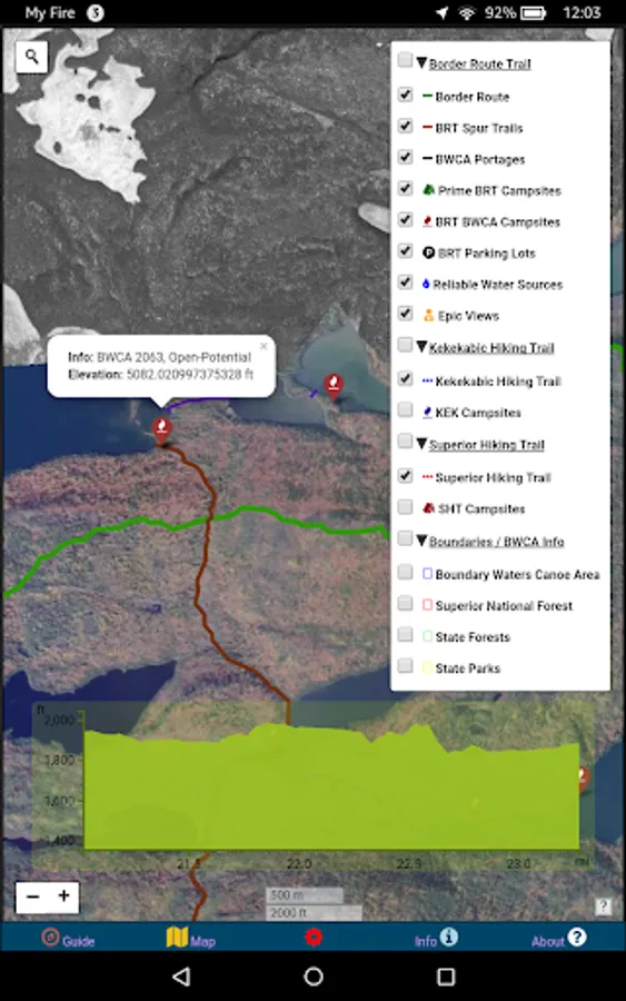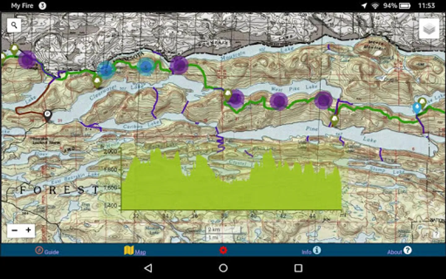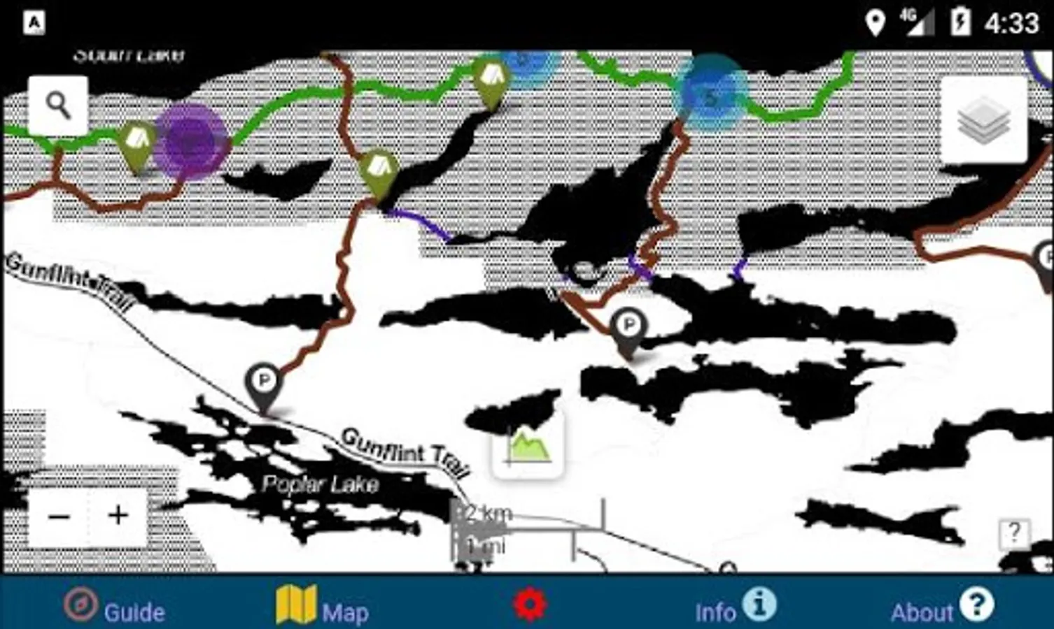 This app was created to assist wanderers in their journey along the BRT. It is loaded with useful trail information including the route of the BRT, portages, spur trails, campsites, vistas, water sources, parking areas, boundaries, evacuation points, and much more! Each data point and trail line is interactive, providing more information when upon tapping. The icons are informative and color-coded for immediate recognition, and layers that are not being used can be turned off to simplify the map presentation.