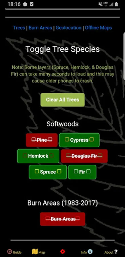 You can manually toggle given tree species on or off if you're an arborist specifically interested in forestry rather than mushrooms. This app is a great way to discover old forest stands or to learn how to identify certain types of trees by look. If you are interested in finding birch bark, oak acorns, or sugar maples, just turn on a given layer and eliminate the guessing and frustration! Need some pine needles and cones for an art project? Pick from thousands of woodland patches laden with beds of them!