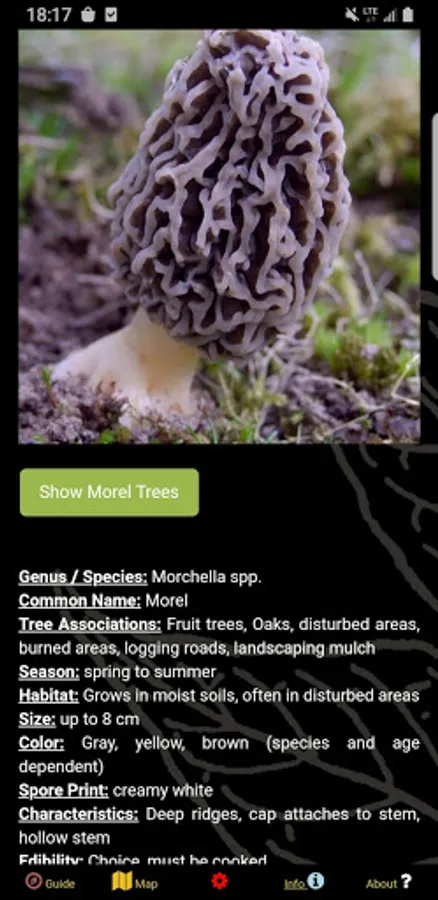 There is a wealth of useful information including descriptions of the different mushrooms and details on their characteristics. These sections even have buttons which will filter the map to show only tree species that are associated with a target mushroom! It is truly that easy...you want to find morels? Turn on the app, Show Morel Trees, and plot your GPS location to find the nearest forest stands where morels likely spawn.
