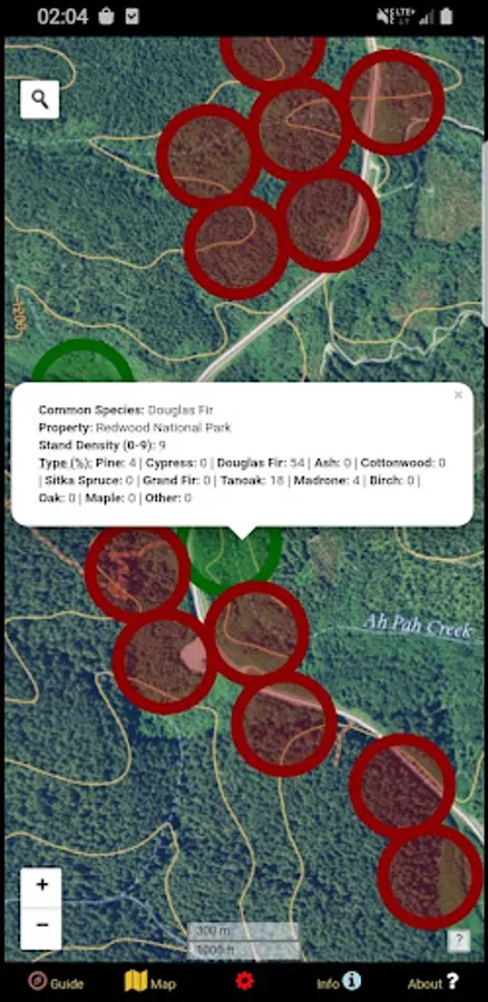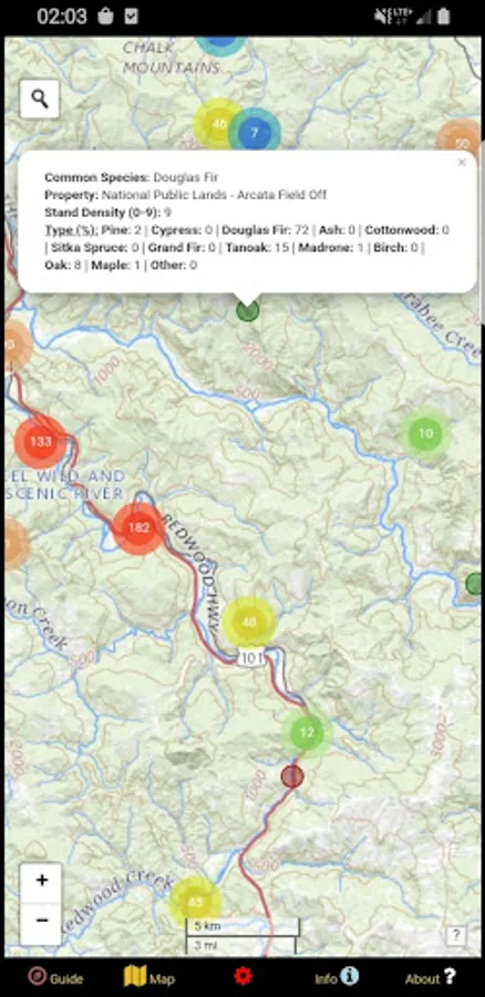 In addition to defining the link between trees and mushrooms, this app goes one step further. An inventory of millions of data points from forest stands across the state has been filtered and processed to clearly highlight specific areas that have the highest probability of yielding a harvest of mushrooms. These circular polygons are color-coded by species and attributed with useful information such as tree family and tree density, along with land unit name, so you can quickly differentiate between tree types in the map view and target the best areas to search. Indicator species referenced include Pine, Cypress, Redwood, Sitka Spruce, Grand Fir, Douglas Fir, Ash, Cottonwood, Oak, Maple, Tanoak, and Madrone. Even burn areas are included to help find Morels!