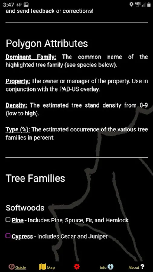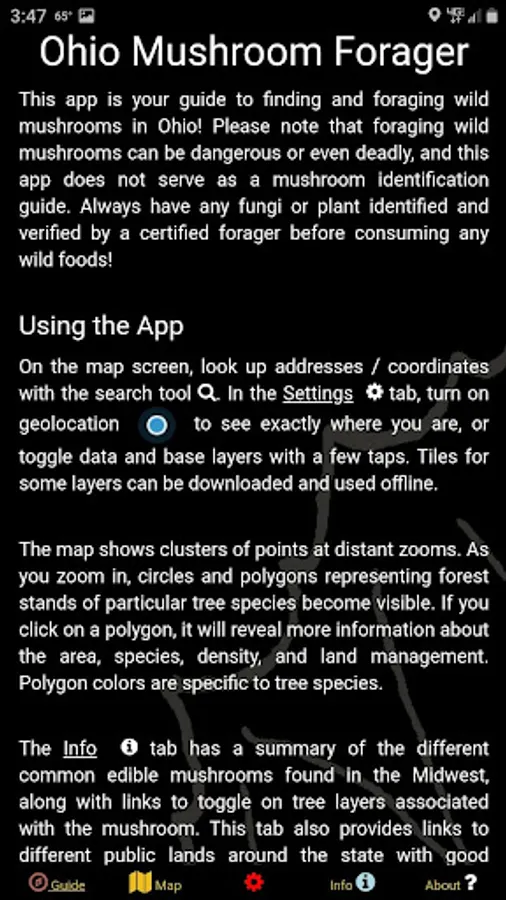 There is a wealth of useful information including descriptions of the different mushrooms and details on their characteristics. These sections even have buttons which will filter the map to show only tree species that are associated with a target mushroom! It is truly that easy...you want to find morels? Turn on the app, Show Morel Trees, and plot your GPS location to find the nearest forest stands where morels likely spawn.