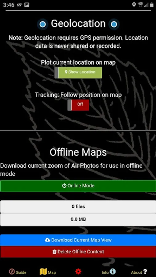 This app is designed for the wilderness! Integrated geolocation makes it easy to figure out exactly where you are and track your precise movement, even in the thickest of tree stands. You can download offline map tiles in advance if you are planning to venture beyond the reach of a cellular connection in your quest for fungus. It works just fine in 'Airplane Mode'!