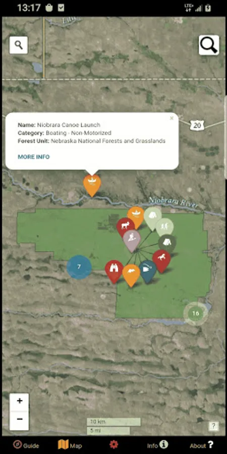 Once using the app, there are five screens. The Guide screen will provide data legends as well as helpful tips for optimizing your navigational experience. On the Info screen, you will find a number of spatial links to the different Forest Service forests, grasslands, and wildernesses. This is a great way to quickly locate specific places and discover new places to explore! The About screen provides links to all of the open-source resources used in the app and gives a little information about the developer GeoPOI. The Map Settings screen is where you can change between one of four different basemaps, download offline imagery, turn on geolocation, and toggle specific point categories. Finally, the Map screen is where it all comes together!
