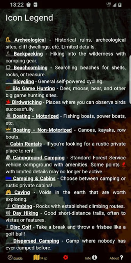 Whether you are a seasoned forest wanderer or are just wanting to learn a little more about the amazing places surrounding your home turf, this app is for you! The data is up to date as of Winter of 2020 and contains over 80,000 recreational points and other features on Forest Service land. These points are symbolized with over 80 color-coded icons that differentiate between the wide variety of categories. The main groups for these categories include Hiking / Biking, Camping / Lodging, Hunting / Fishing, Informative, Other Recreation, Searching, Water Related, and Winter Related.