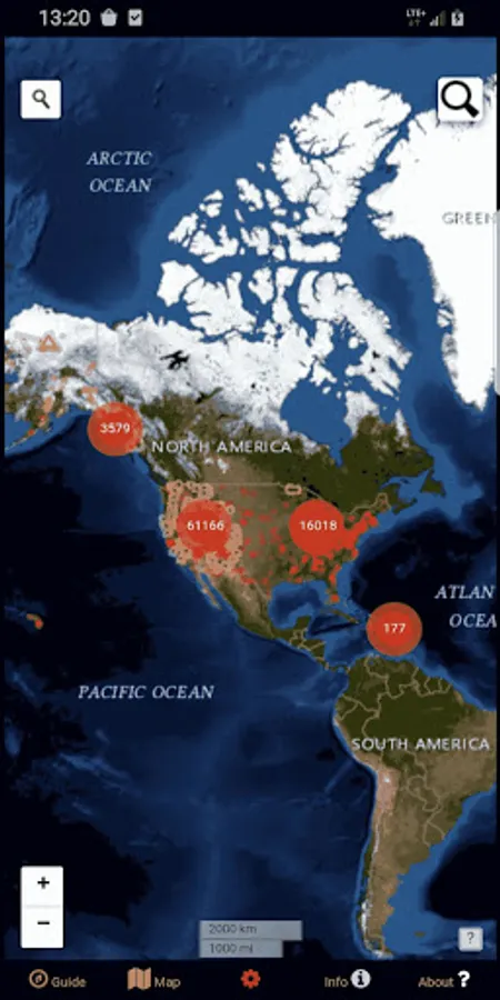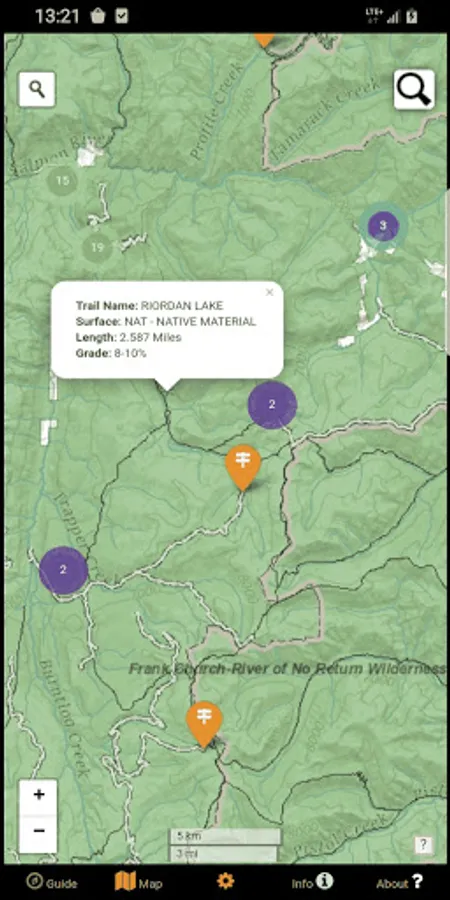 On the Map screen, there are a series of circle clusters at distant zooms that indicate how many points are within a given cluster. As you tap the clusters to zoom in, individual points and icons become visible, along with trails, roads, and boundaries. These features can be clicked on to reveal the name, location, and other useful information. The map screen also has two search tools - the left one can be used to look up addresses and towns, while the right one will allow you to query the names of the features in the database.
