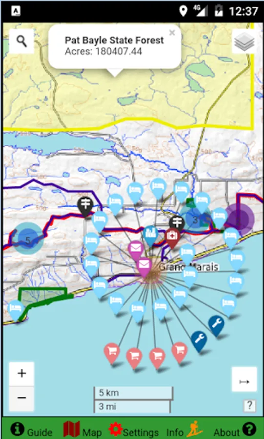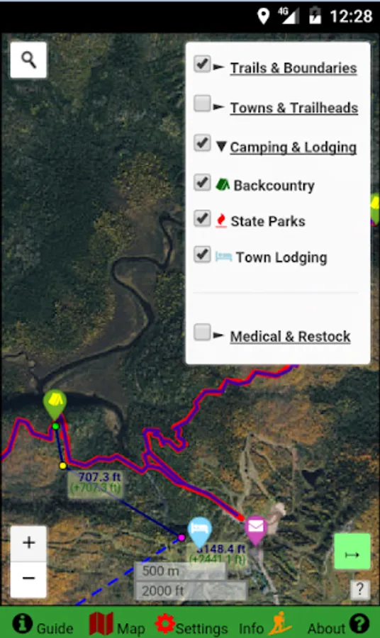 Several useful overlay layers can be toggled to allow users to create their own custom map. These layers include trail line tracks, State Park and Forest boundaries, and the locations of trailheads, campsites, lodging, grocery stores, medical services, towns, and gear outfitters.