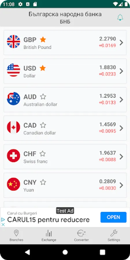 Over 50 currencies tracked, including: Euro, US Dollar, British Pound, Hungarian Forint, Swiss Franc, Polish Zloty, Bulgarian Lev, Canadian Dollar, Moldovan Leu, Turkish Lira, Australian Dollar, Swedish Krona, Danish Krone, Ruble Norwegian Yen, Czech Crown, etc.