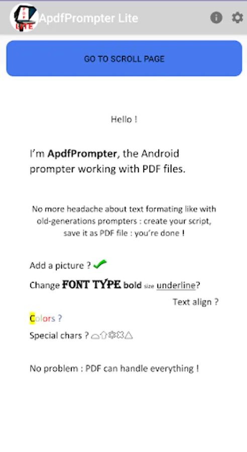 I’m ApdfPrompter, the free Android prompter working with PDF, Google Docs and text files.