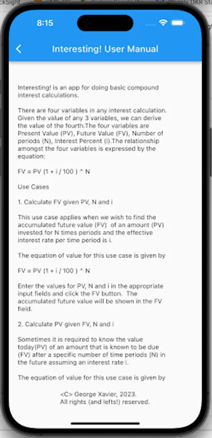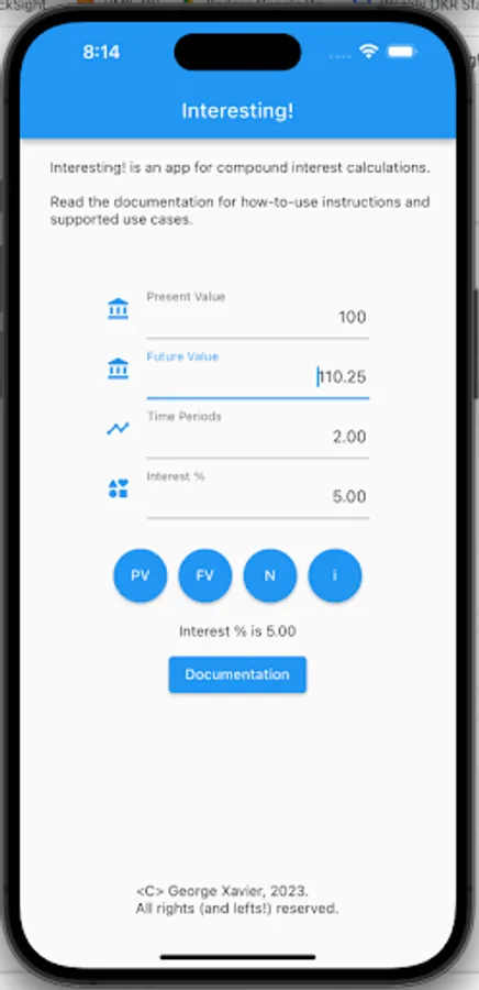 Interesting! is an app that supports compound interest calculations. It comes with documentation on how to use the calculator as well as details on the use cases covered.