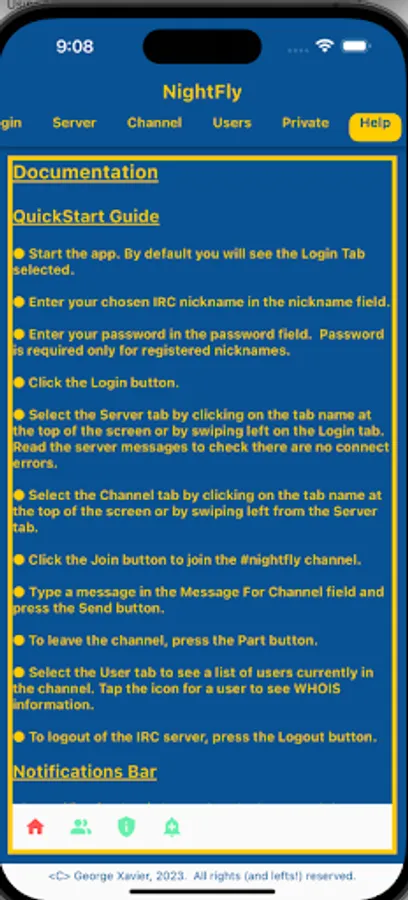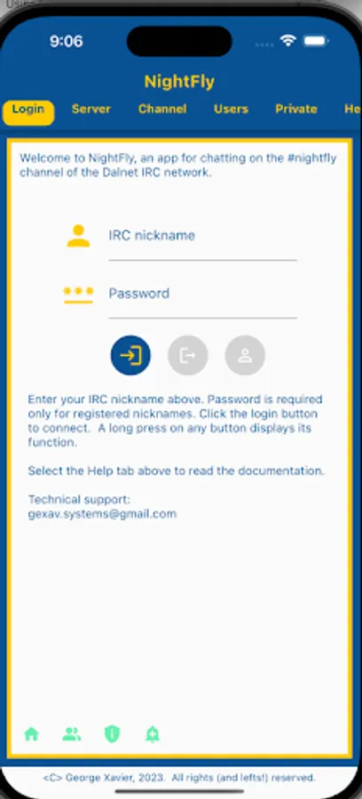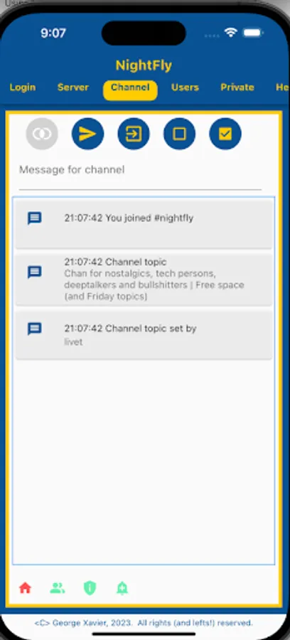 It is intended as a special-purpose app exclusively designed for the users of the #nightfly channel. As such it is limited to chatting only on this channel. Private messages can however be exchanged with other IRC users.