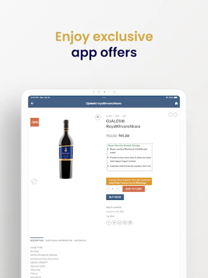By downloading this app, you not only gain access to some of the most popular and best selling wines and spirits. You will jump to the front of the queue for small parcel, limited releases of interesting labels available only to Georgian Wine Store. You will also enjoy exclusive app only special deals. And if you like to discover great wines that are off the beaten track or learn about wine related hacks.