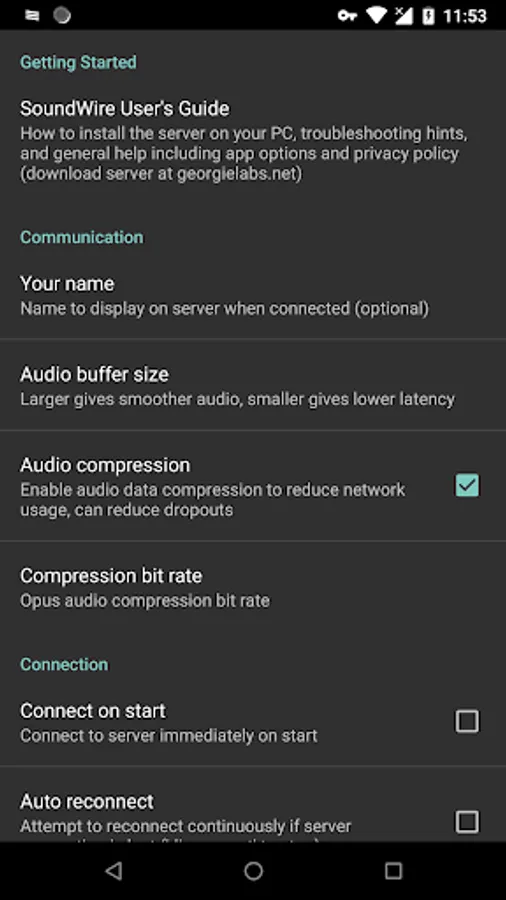 Before using SoundWire on your Android device you must install and run the SoundWire Server application on the Windows/Linux PC or laptop which is your source of music, web audio streaming, or other sounds. Raspberry Pi is also supported. Download the server at https://georgielabs.net (do NOT obtain the server from any other web site).
