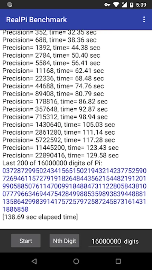 Leave comments with your Pi calculation time on the AGM+FFT formula for 1 million digits. Also the most digits you can calculate, which tests your phone's memory. The author's Nexus 6p takes 5.7 sec for 1 million digits. Note that the AGM+FFT algorithm works in powers of 2, so calculating 10 million digits takes just as much time and memory as 16 million digits (the internal precision is shown in the output). On multi-core processors RealPi tests the performance of a single core. For accurate benchmark timing ensure that no other applications are running and your phone is not hot enough to throttle the CPU.