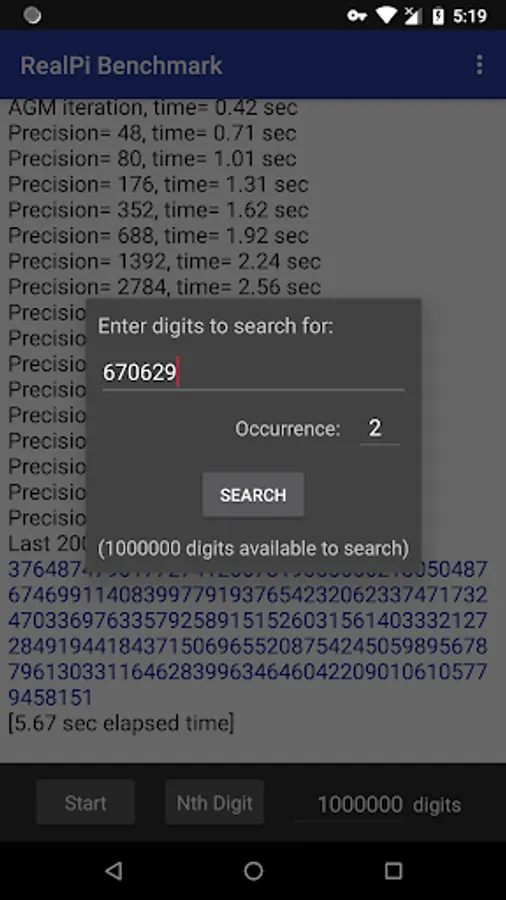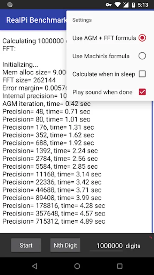 -Machin's formula: This formula was discovered by John Machin in 1706. It's not as fast as AGM + FFT, but shows you all the digits of Pi accumulating in real time as the calculation proceeds. Choose this formula in the settings menu and then press "Start". It's written in Java using the BigDecimal class. Calculation times may start to get long around 200,000 digits, but on modern phones you can calculate and view 1 million digits using Machin if you're patient.