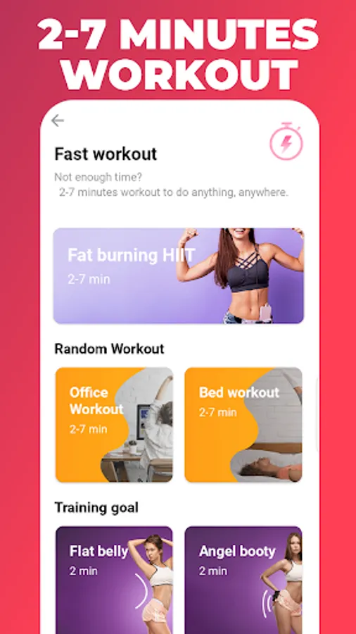 Fast workouts, with the duration from 2-7 min, are specially designed for people with a busy schedule. You can do them anywhere, office, bed, home, etc.