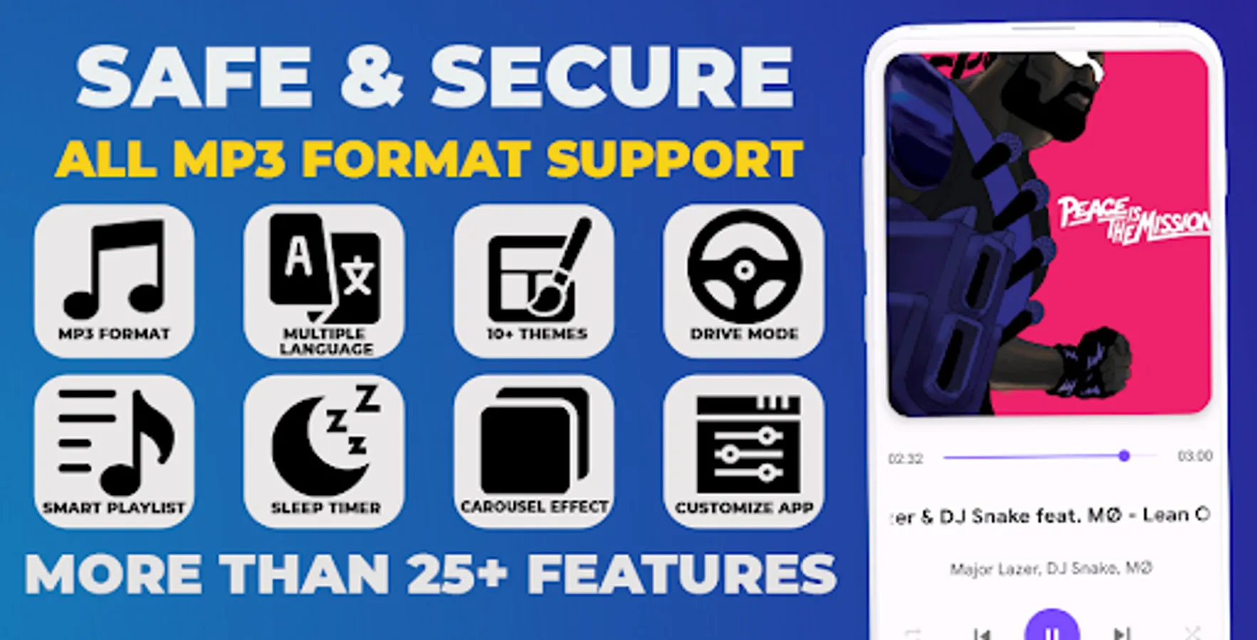 Not only an MP3 player, Music Player supports all music and audio formats including MP3, MIDI, WAV, FLAC, AAC, APE, etc. And play them in high quality.