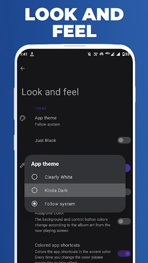 You can choose between three different main themes: Clearly white, Kind dark and Just black for AMOLED displays. Select
