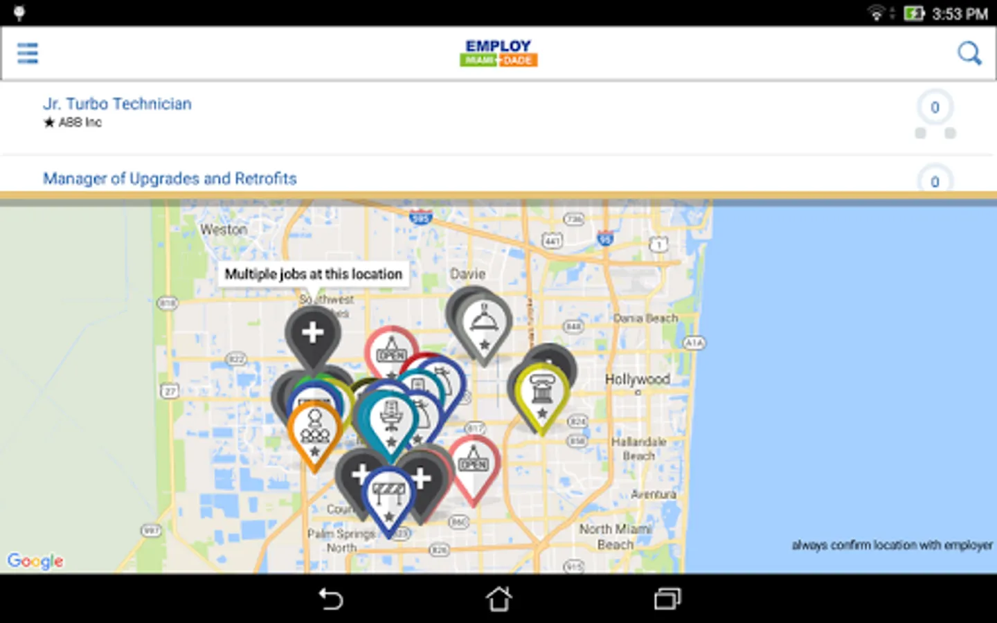 With Employ Miami Dade Mobile’s unique “Jobs Nearby” function you can easily map all the latest jobs near your current location. Search for jobs around your neighborhood or a different location. Simply tap color-coordinated pins to see more information or to apply for a job.