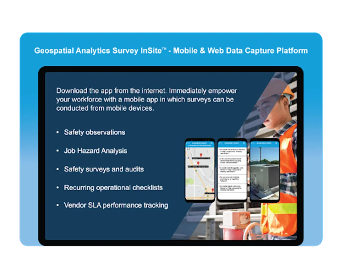 The Geospatial Analytics Survey InSite™ application is a progressive new way to complete site inspections in a fraction of the time that a traditional pen-and-paper. Spreadsheet of e-form based site inspection takes.