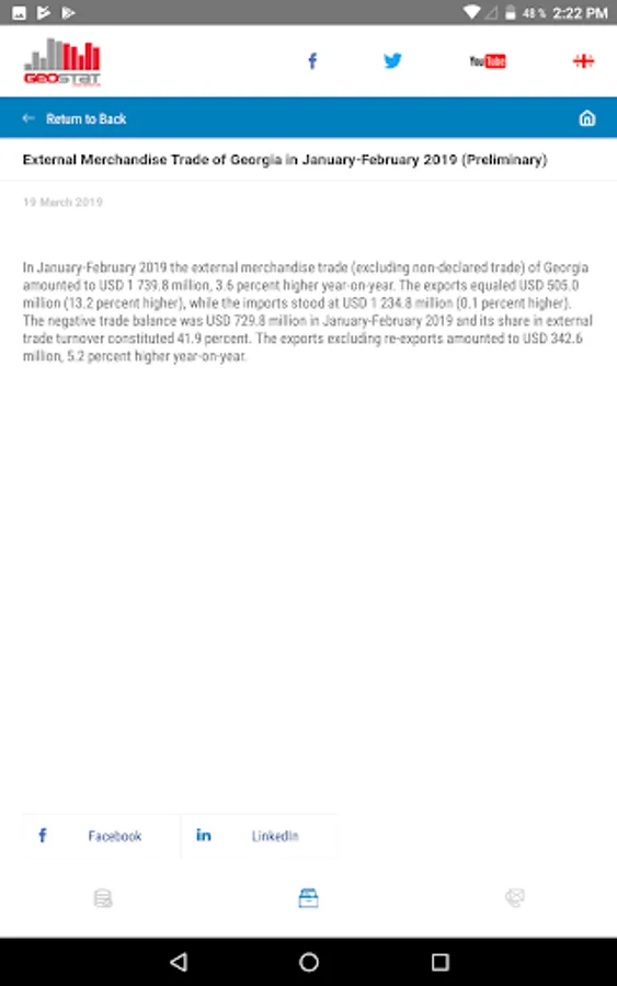 Legal Entity of Public Law - National Statistics Office of Georgia is an institution established for the purpose of conducting statistics and dissemination of statistical information in accordance with Georgian legislation.