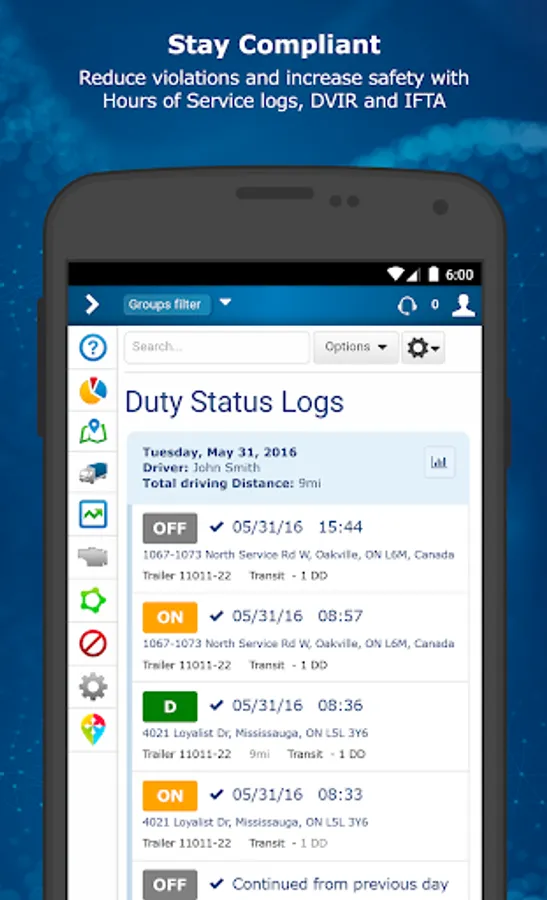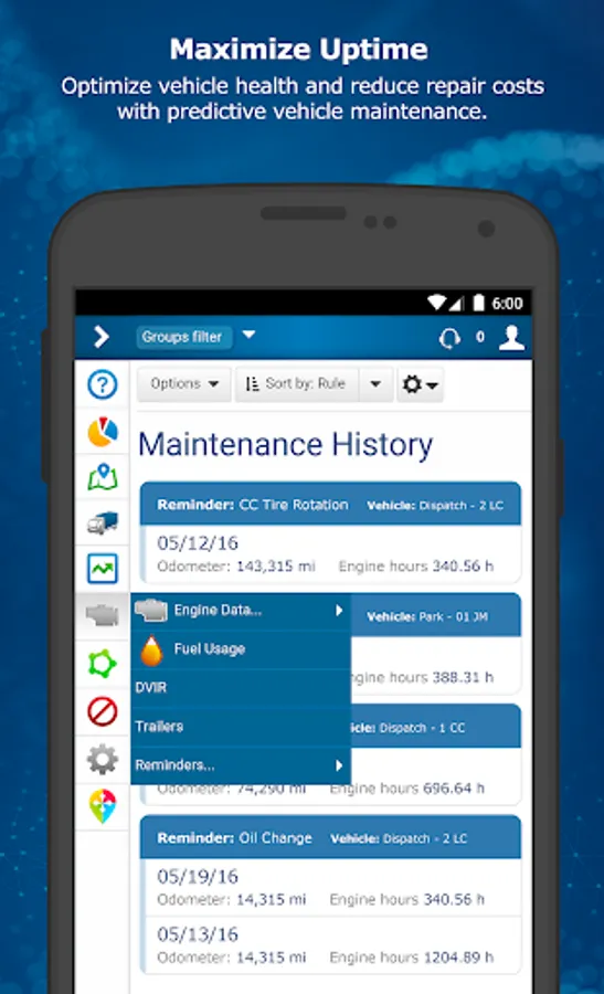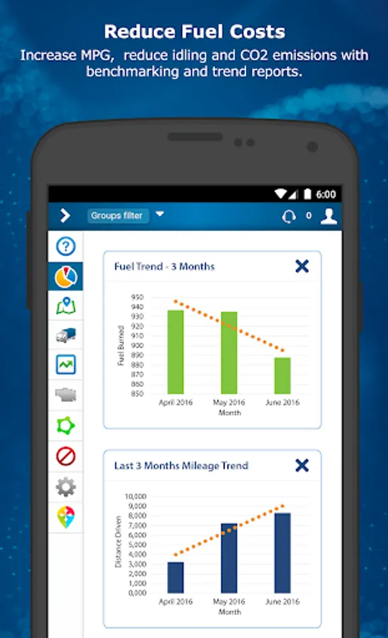 Dashboard reports make it easy to visualize trends in fuel consumption, idling, and more. Optimize routes and proactively manage vehicle maintenance. Stay compliant with Hours of Service (HOS), DVIR, and Driver ID. MyGeotab helps you reduce fuel costs, maximize uptime, and improve fleet safety.