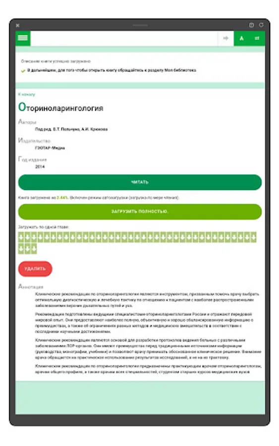 The application is intended for reading electronic editions placed in the electronic library system "Student's Consultant" posted on the website www.studentlibrary.ru without permanent access to the Internet (offline).