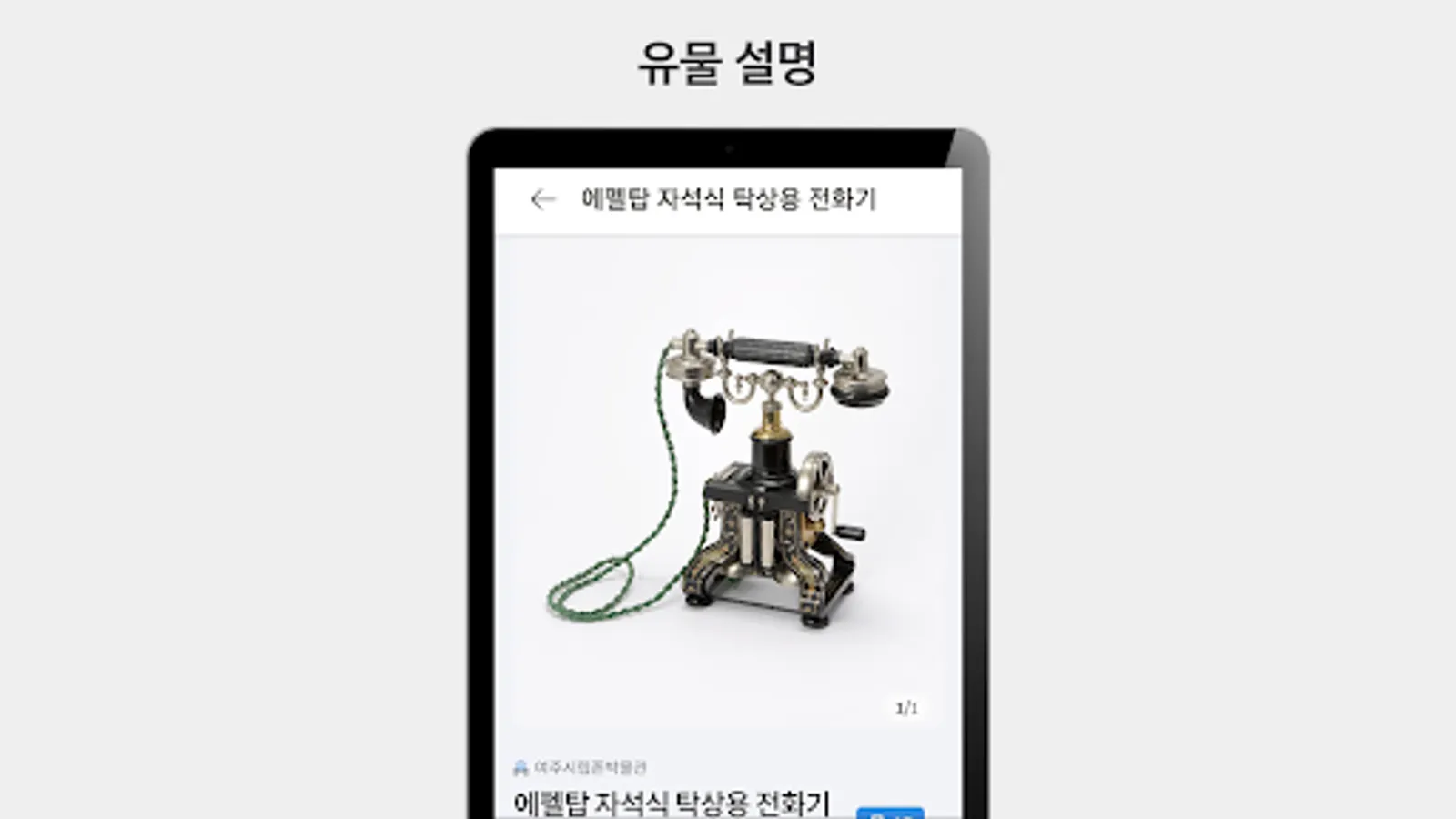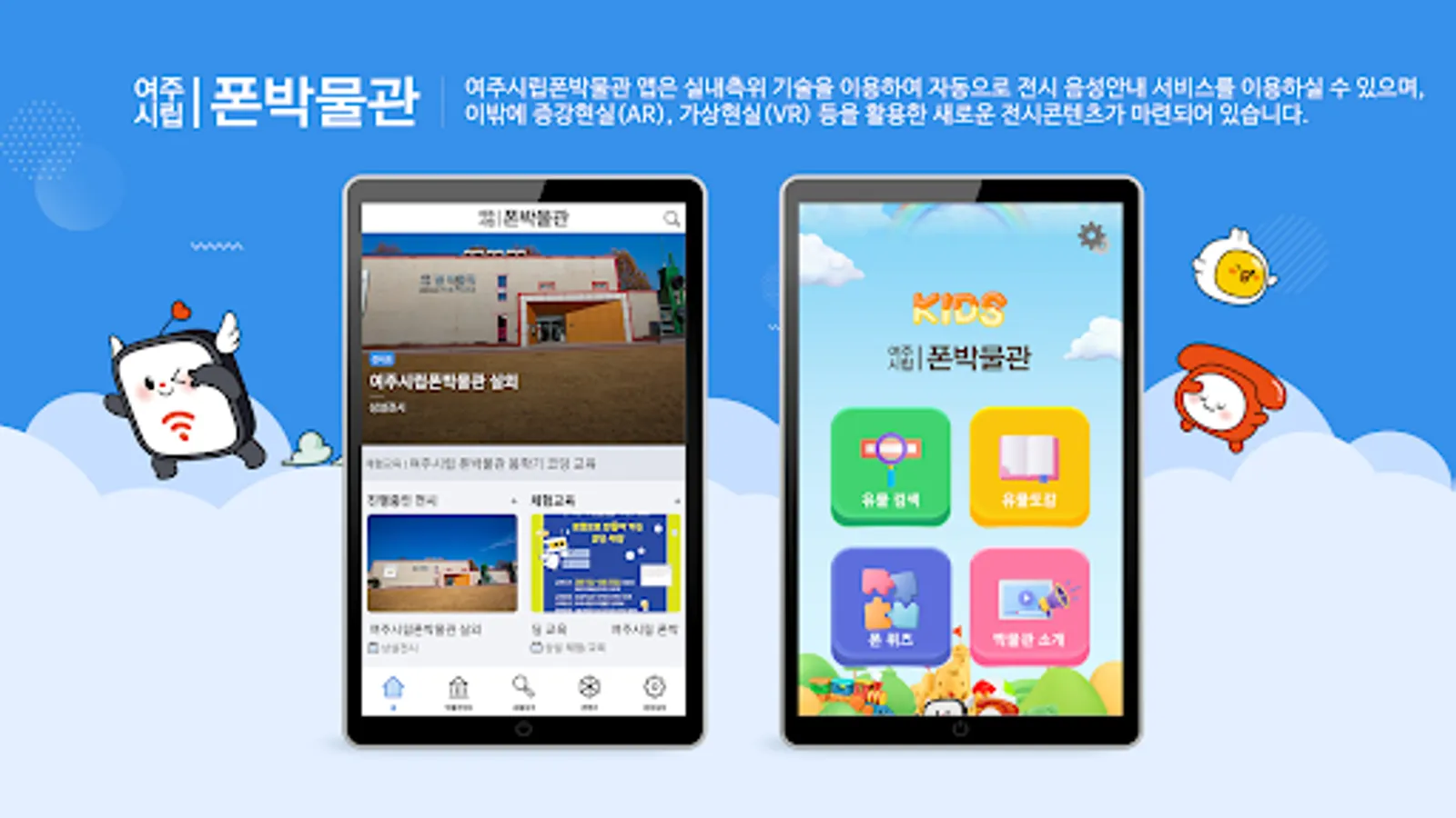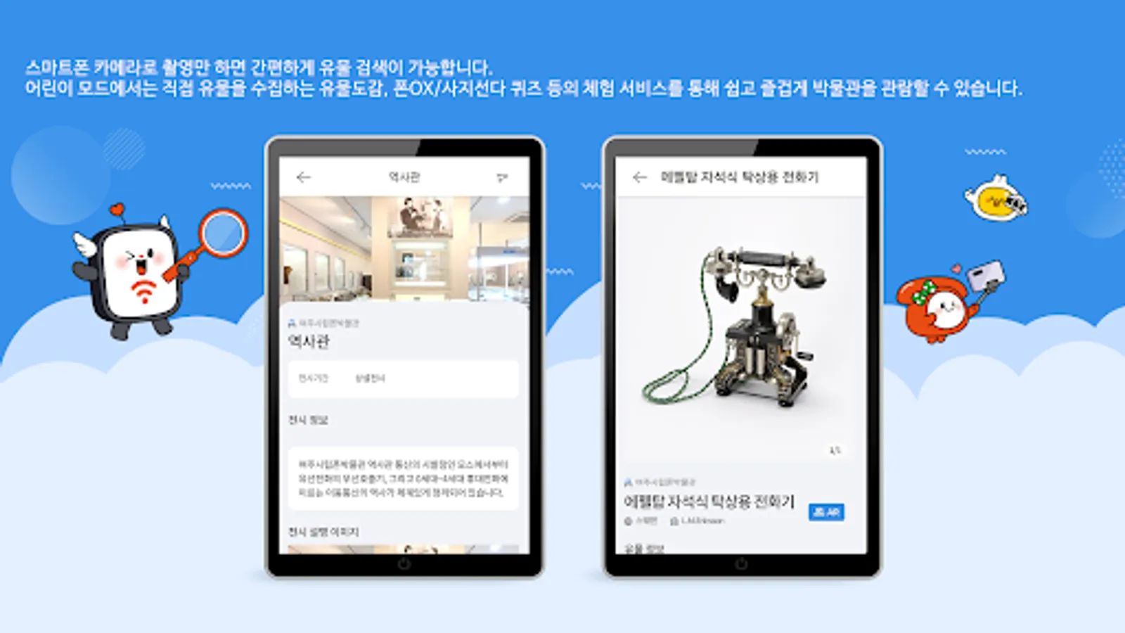 The Yeoju City Phone Museum app uses indoor positioning technology to automatically use the exhibition voice guidance service, and you can easily search for artifacts simply by shooting with a smartphone camera. In addition, new exhibition contents using augmented reality (AR) and virtual reality (VR) are prepared. In the children's mode, you can easily and happily visit the museum through experiential services such as the collection of relics and the phone OX/quadruple quiz.